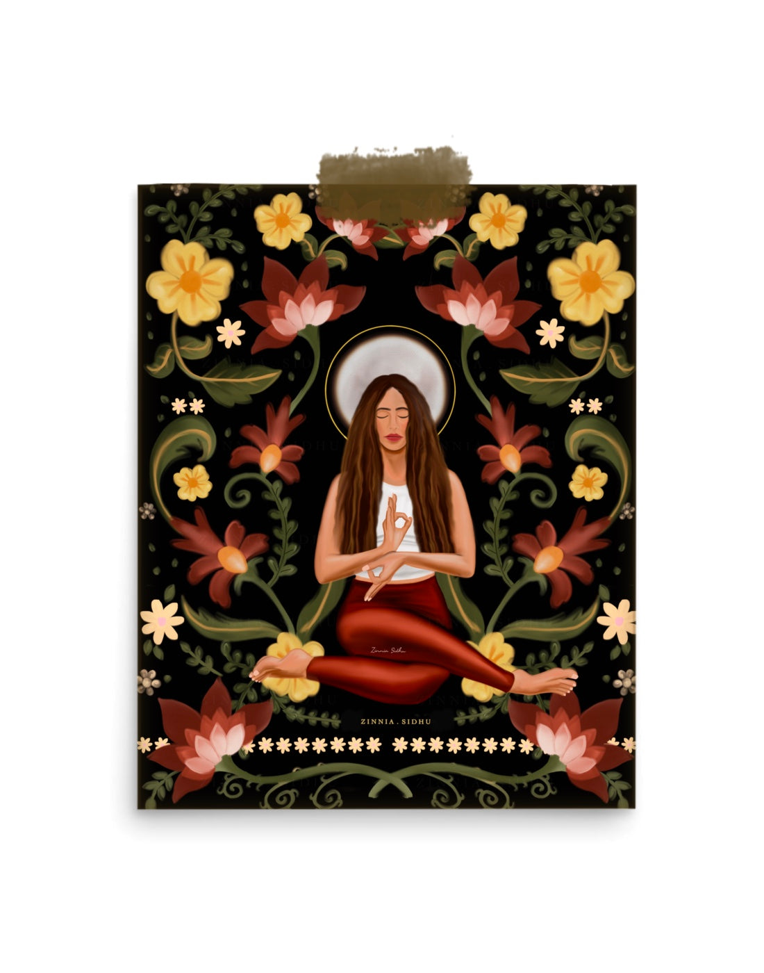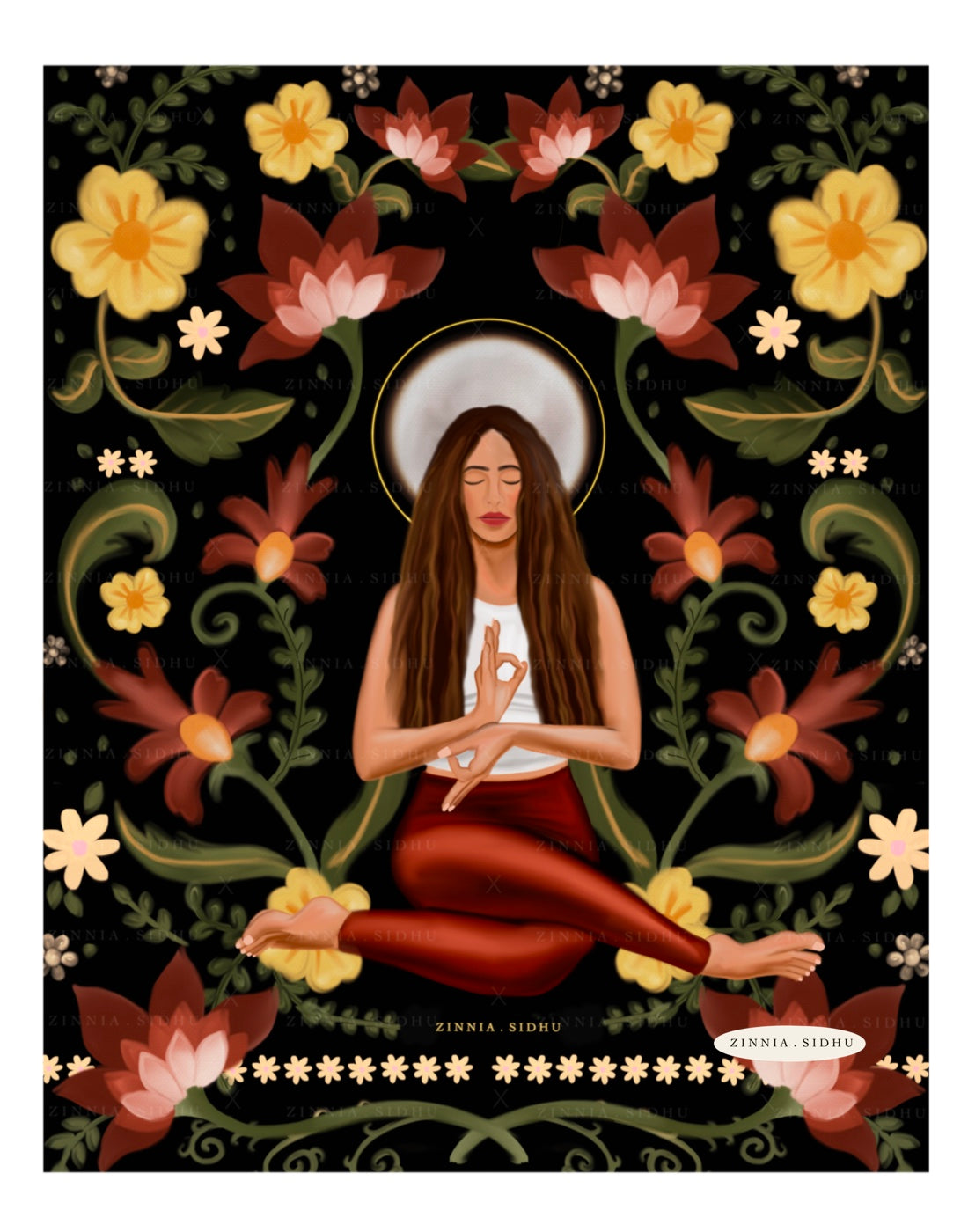 A YOGI GIRL WITH THE FLORAL PATTERN IN THE BACKGROUND.